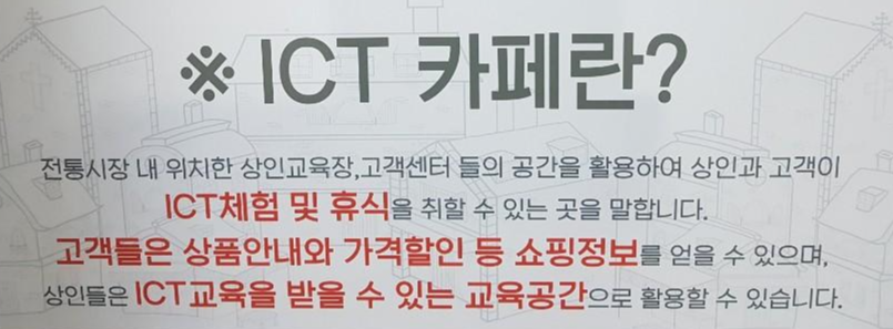 ICT 카페는 전통시장 내 위치한 상인교육장, 고객센터들의 공간을 활용해 상인과 고객이 ICT체험 및 휴식을 취할 수 있는 곳을 말합니다.
