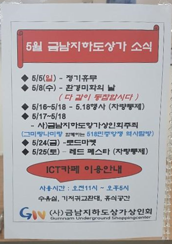 ICT 카페 출입문에는 금남지하도상가 소식이 붙어 있습니다.