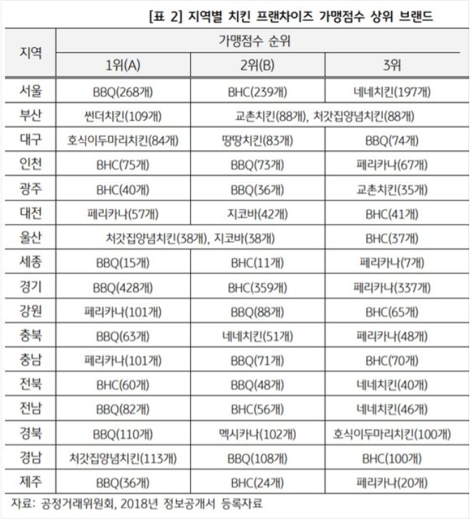 가맹점이 가장 많은 브랜드는 BBQ(1천659개)로 2015년 이후 4년 연속 가맹점 수 1위를 지키고 있습니다. BHC(1천456개), 페리카나(1천176개), 네네치킨(1천37개)이 뒤를 이었습니다.